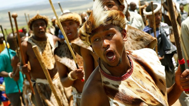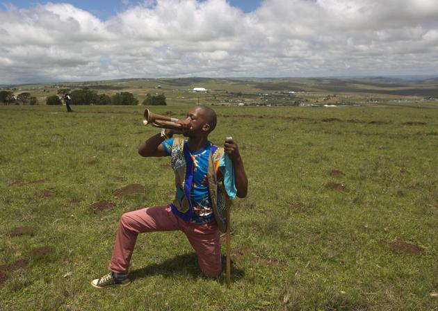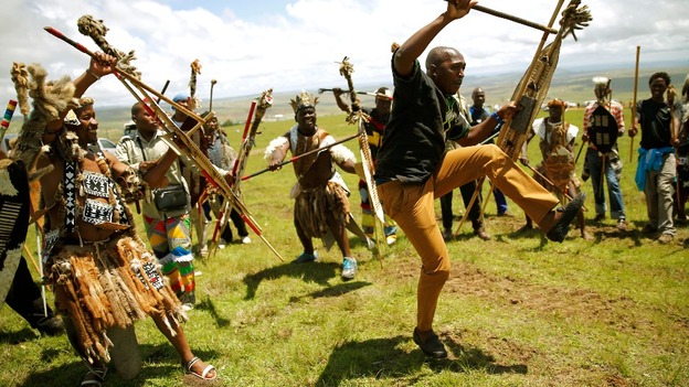 “At one spot overlooking Mandela’s compound, several hundred people gathered to watch the televised ceremony. A group of Zulu traditional dancers with spears and shields gathered nearby to pay their last respects to Mandela.”