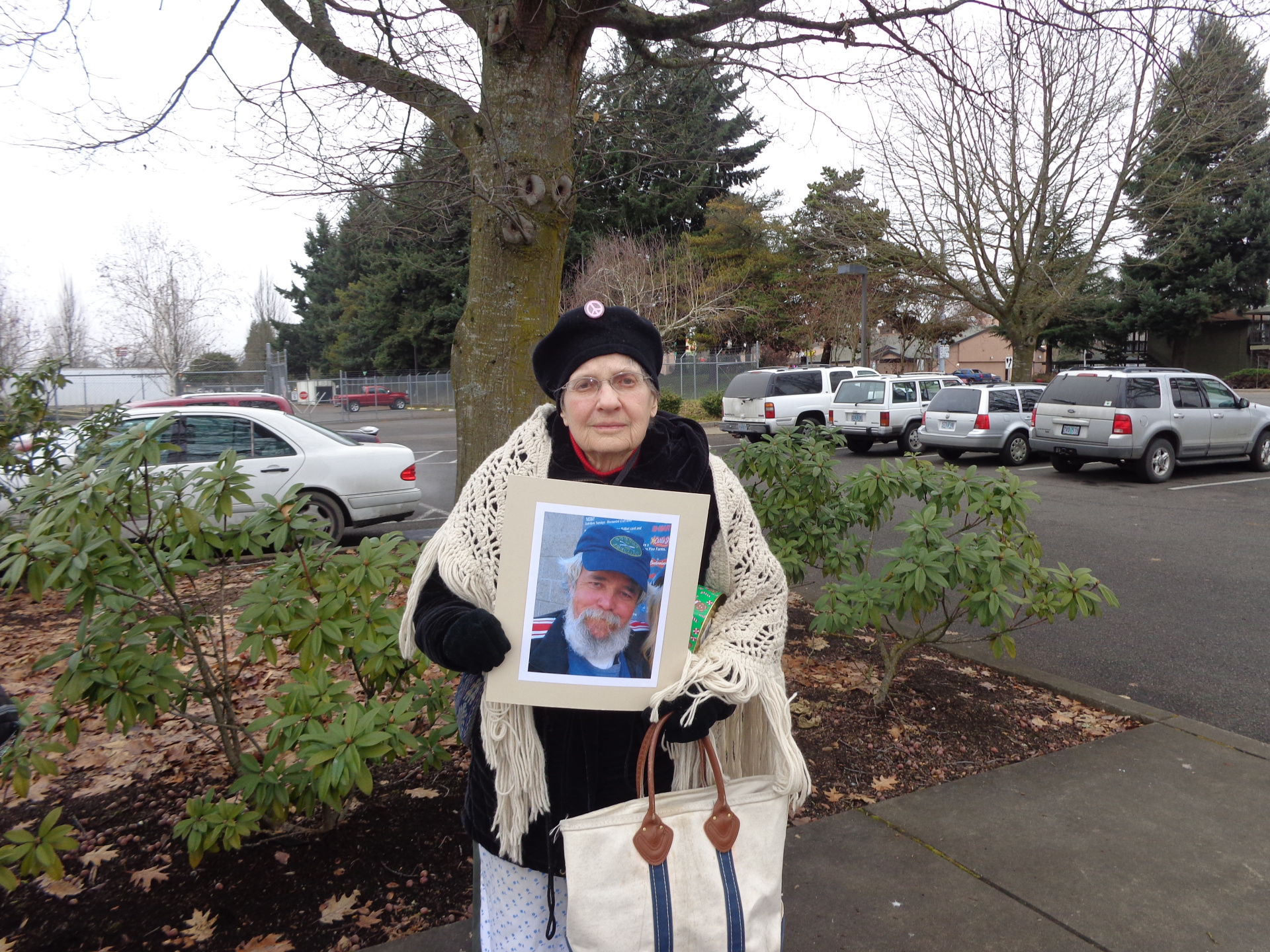 Rushing outside, I whip my camera out and – here they come – fresh out of jail. I am getting the shot of a lifetime, these arrestees standing together holding up a clenched fist! Unfortunately, I didn’t hit the record button properly! I missed my interview with Peggy, who was dressed like Mrs. Samaclaus. I told Peggy about my homeless friend being kicked out of the EMX station while sitting there listening to the World Series, and asked of she would hold a pic of Hollis I made copies of for Elizabeth and Rossetta. Above is that shot that says it all. Hollis fought for the United States Government and was harassed for being homeless. Peggy got arrested for wanting to keep the Post Office open, if not just for someone like me, who wants to send a Soldier home, along with the Stars and Stripes he fought under.