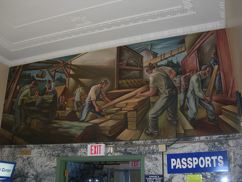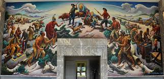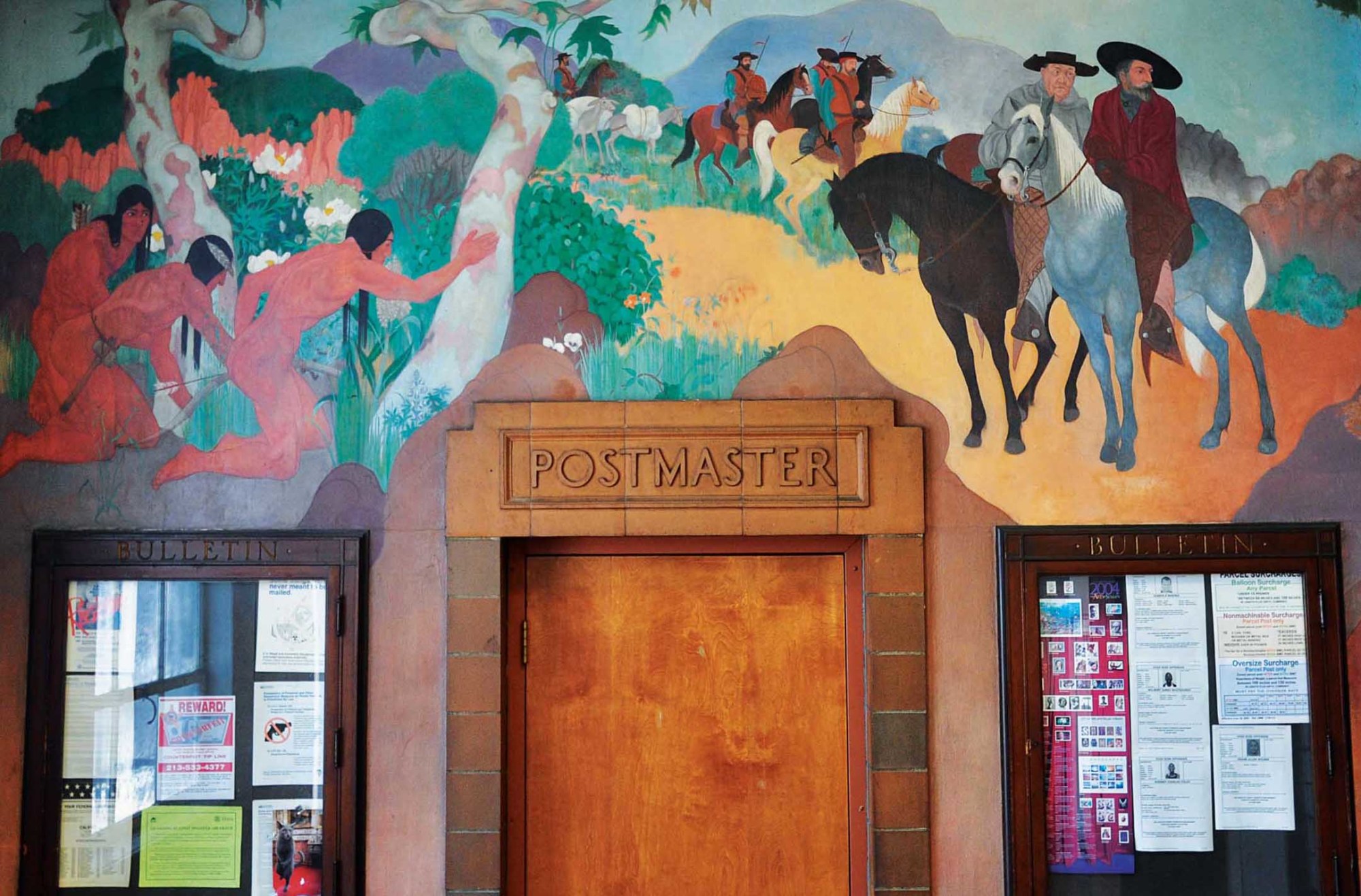 The art director for the movie ‘Inherent Vice’ works with the mural of Gaspar de Portola in Pynchon’s book. I suspect Tom is paying homage to our ex-wife, Mary Ann Tharaldsen, who is an artist in the same family tree as the Benton muralist, who are kin to ‘The Trailblazer’ John Fremont. Above is a mural in my local post office where I got my pass port. These doors are entrances to another dimension that art directors are hired to locate. I thought about being a art director so I could be someone, and thus not make folks around me, nervous with my unlimited imagination and talent in many fields. Calling me insane allows folks to come in my being, and take all they can!