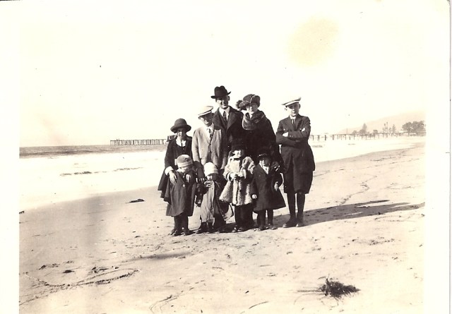 Above is a photograph of my kindred on the beach at Ventura where the Rosamond family lived. I suspect my grandfather took this photo of his wife, his four children, the two sons of his murdered sister-in-law, Eutrophia, and perhaps Eutrophia’s daughter that no one knows anything about. The tall gentleman I believe is Conrad Wieneke, Mary Rosamond’s brother who owned several homes in Ojai and Ventura. He never married, and had no children.