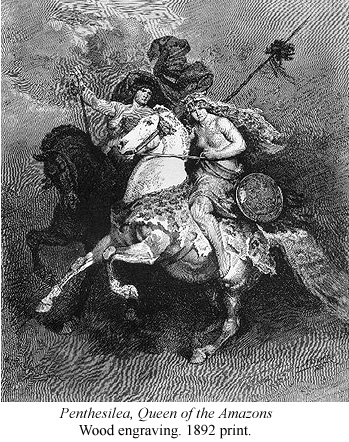 Queen Eleanore the wife of King Henry, whom Wace presented his Roman de Rou, saw herself as Penthesilea who worshiped the goddess Artemus, the Greek Diana. Penthesilea sided with the Trojans ad was killed by Achilles. Eleanore rode about on a white horse as Penthesilea bidding folks to go on Crusade. Eleanore went on Crusade with her husband the King of France she and her entourage of 300 women dressed in armour. Here was the Queen of the Amazons taking on the scourge of Mahomet, she no doubt inspired by the pseudo history of Geoffrey of Monmouth.