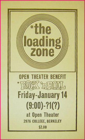 This would have been The Loading Zone’s third performance, to our knowledge, the first two having been two weeks earlier at the Open Theater (Jan 14) and then at the Trips Festival (either Jan 21 or 22). The Loading Zone was based in Oakland.