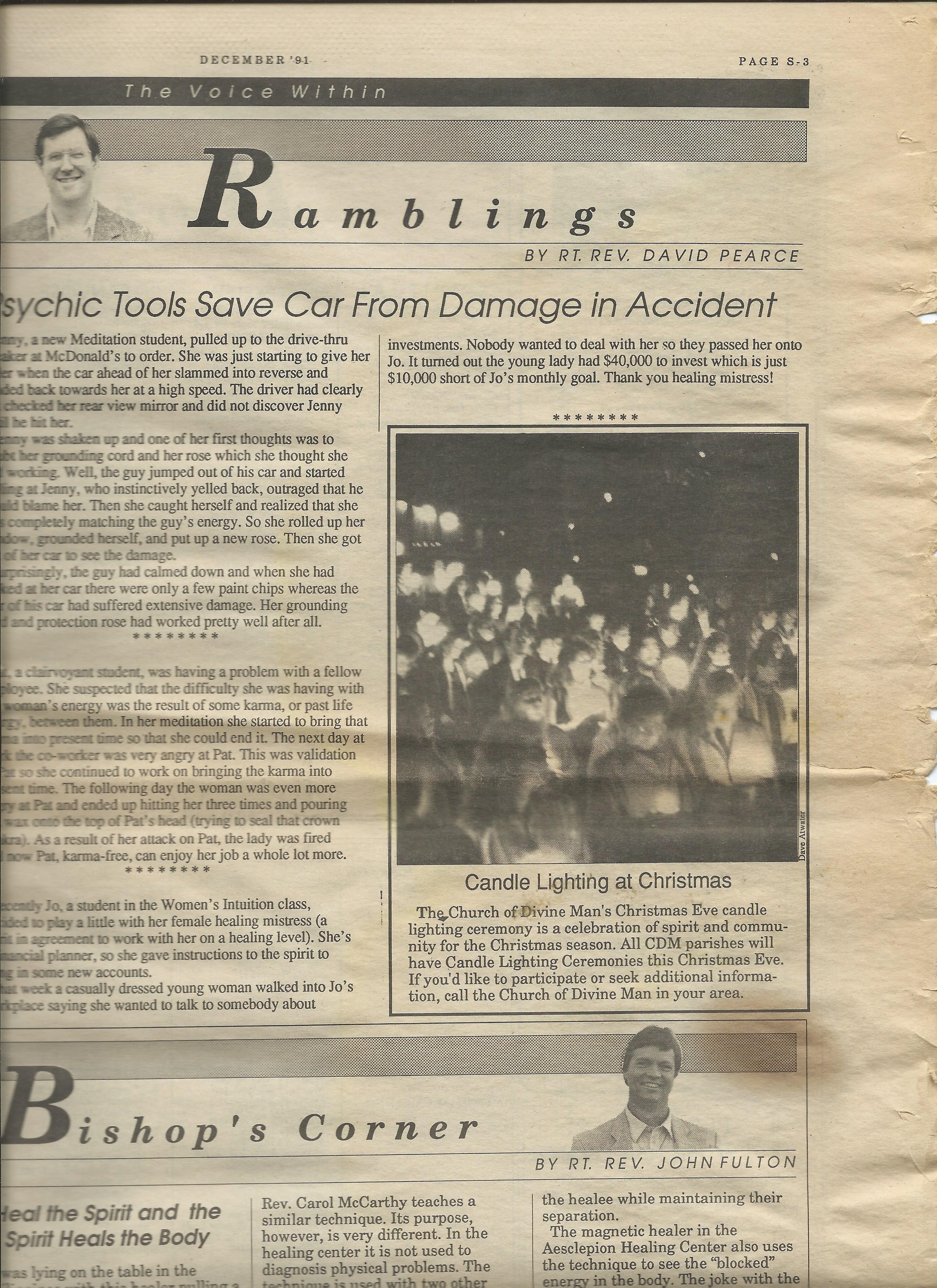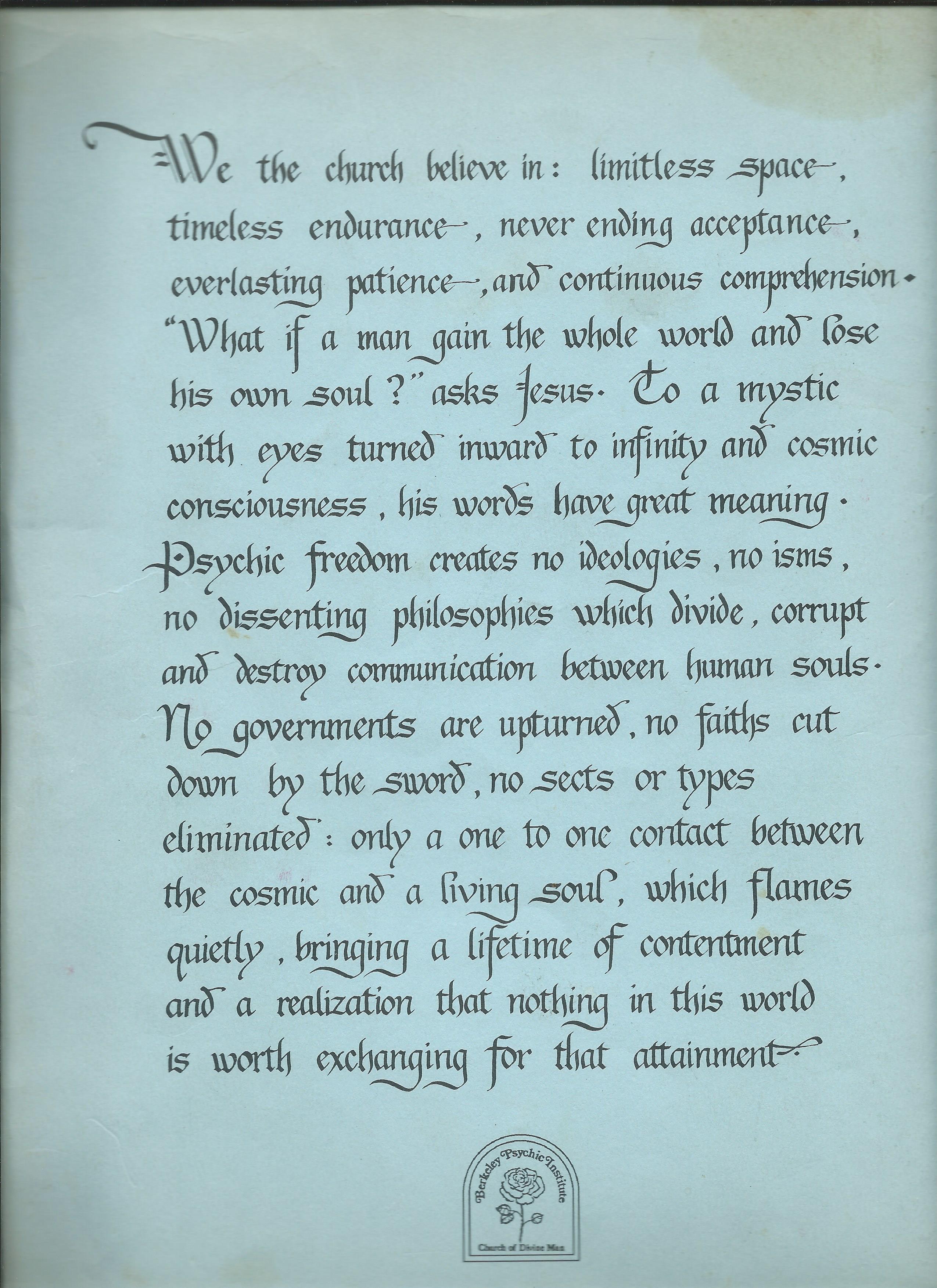 I do not subscribe to everything. I met with Rt. Rev.David Pearce, and he wanted me to found a men’s group in Eugene. I declined. I was doing a lot of work with incest. As a Incest Survivor, I know there is a lot of trouble with credibility. I have debated about writing about my psychic work in fear it would be used by those close to me as a excuse to label me ‘Insane’ then continue to borrow my healing energy.