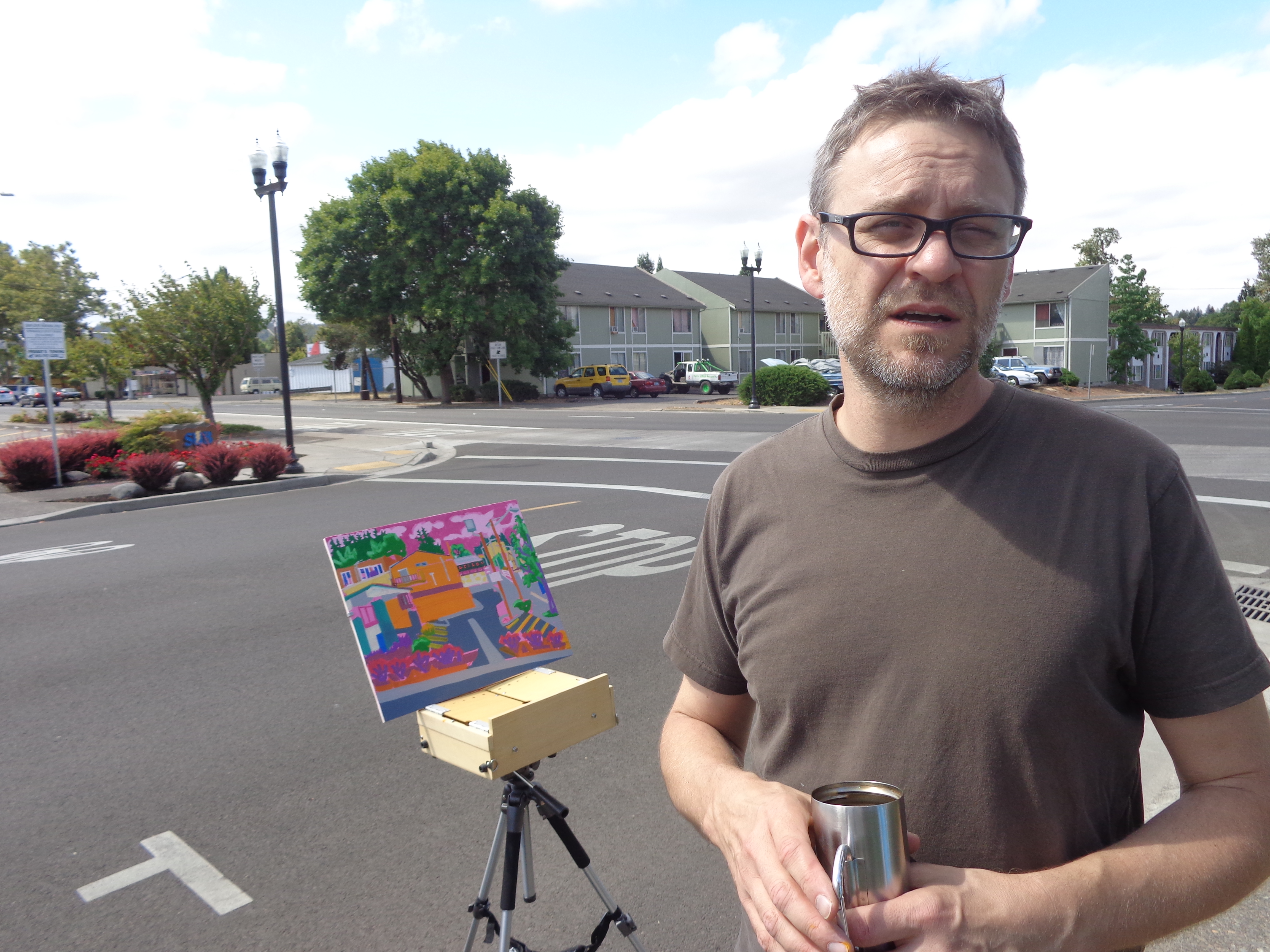 I did not see a lot of funk in her father’s cityscape until James pointed out the purple chair on a balcony. But I raved about where Mr. Schauer set up his easel. Art is where you find it. The eagle has landed!