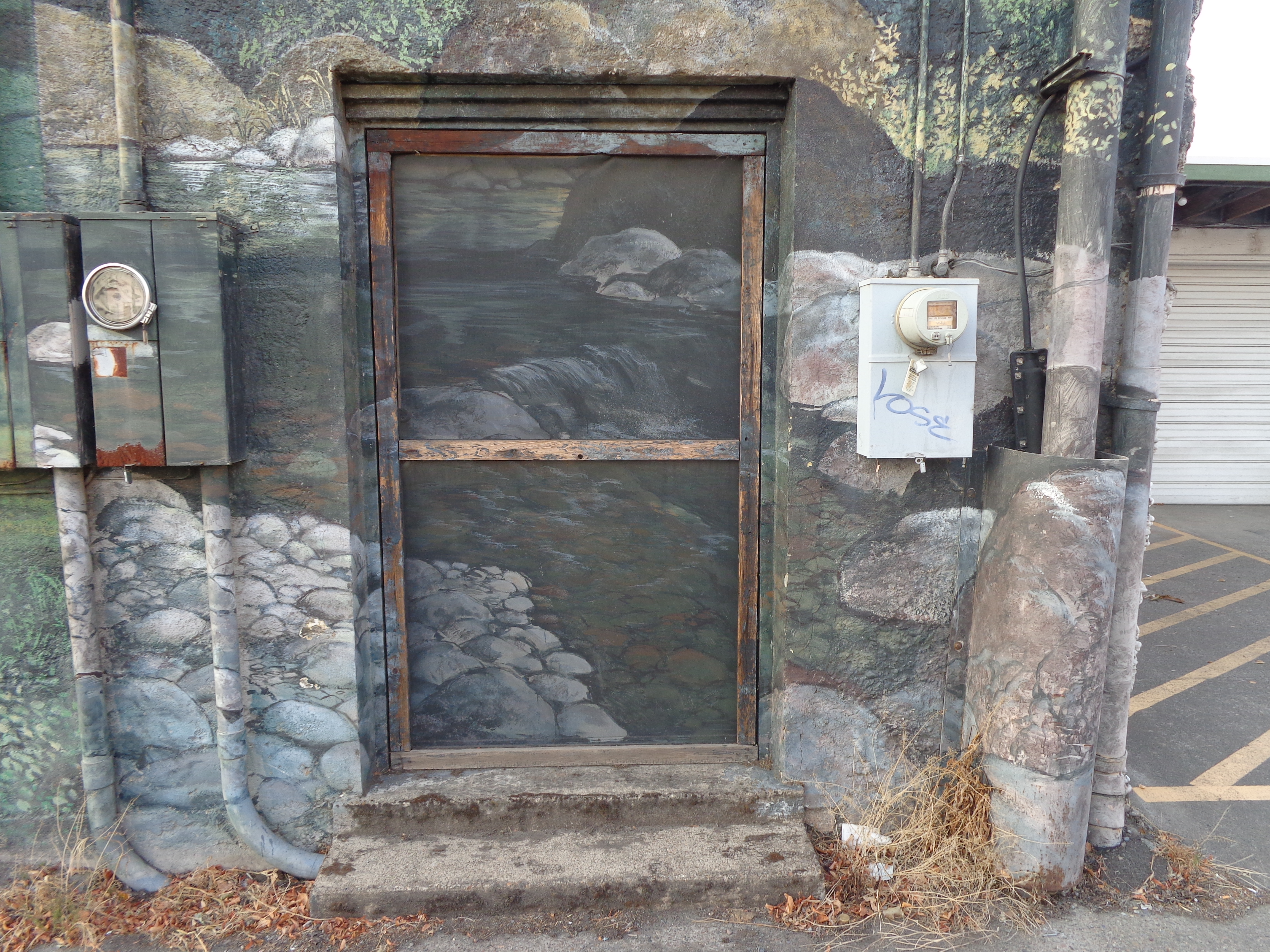Note the tree on the hill in Erin’s mural and the Simpson mural. Then, look at the mural that was rendered on the Creamery wall in place of Sullivan’s work. Note the door and window on the right. This a Portal to another dimension. This photo was taken by a man who made love to Thomas Pynchon’s ex-wife. Beware of ‘The Backdoor Man”.