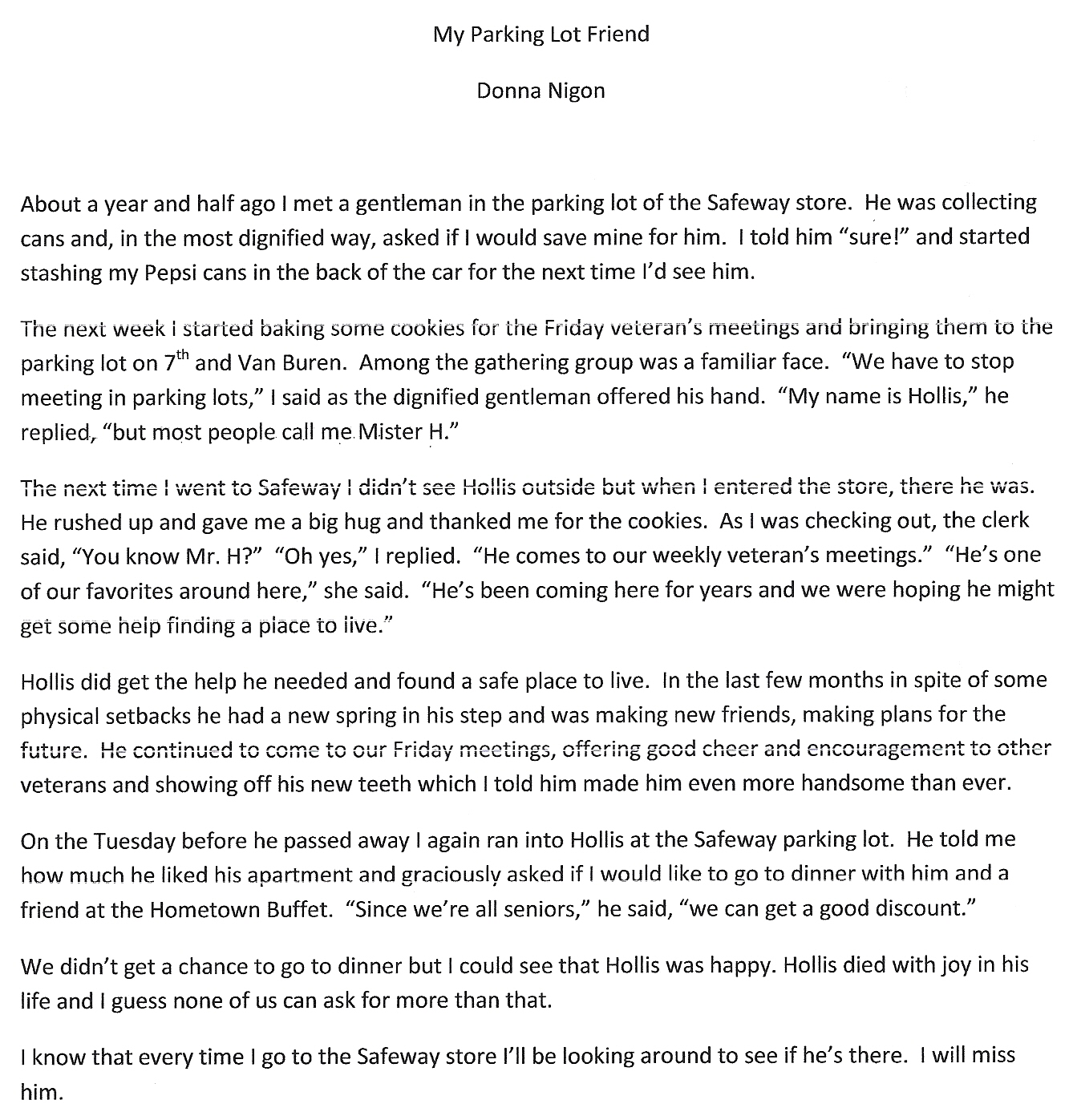 Above is a letter that was left on H’s altar, titled ‘My Parking Lot Friend’. About twelve people spoke and gave similar testimonies.