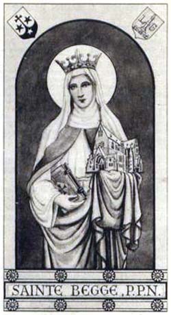 Saint Begga (also Begue, Begge) (615 – 17 December 693) was the daughter of Pepin of Landen, mayor of the palace of Austrasia, and his wife Itta of Metz. On the death of her husband, she took the veil, founded seven churches, and built a convent at Andenne on the Meuse River (Andenne sur Meuse) where she spent the rest of her days as abbess. She was buried in Saint Begga’s Collegiate Church in Andenne.