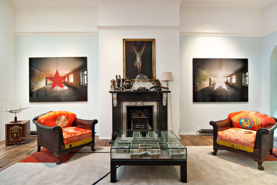 Emmerich’s extensive collection of artwork includes a painting of Jesus Christ wearing a Katharine Hamnett-styled T-shirt during his crucifixion,[36] prints of Alison Jackson‘s works of a Princess Diana lookalike making obscene gestures and engaging in sex acts,[34][37] a wax sculpture of Pope John Paul II laughing as he reads his own obituary,[34][37] and a Photoshopped image of Iranian president Mahmoud Ahmadinejad in a homoerotic pose.[36] Emmerich, who is openly gay,[4] and a financial supporter of U.S. progressive politics,[38] states that the decorations and pieces aren’t declarations of any beliefs,[36] but rather reflections of his “predilection for art with a political edge”.[37]