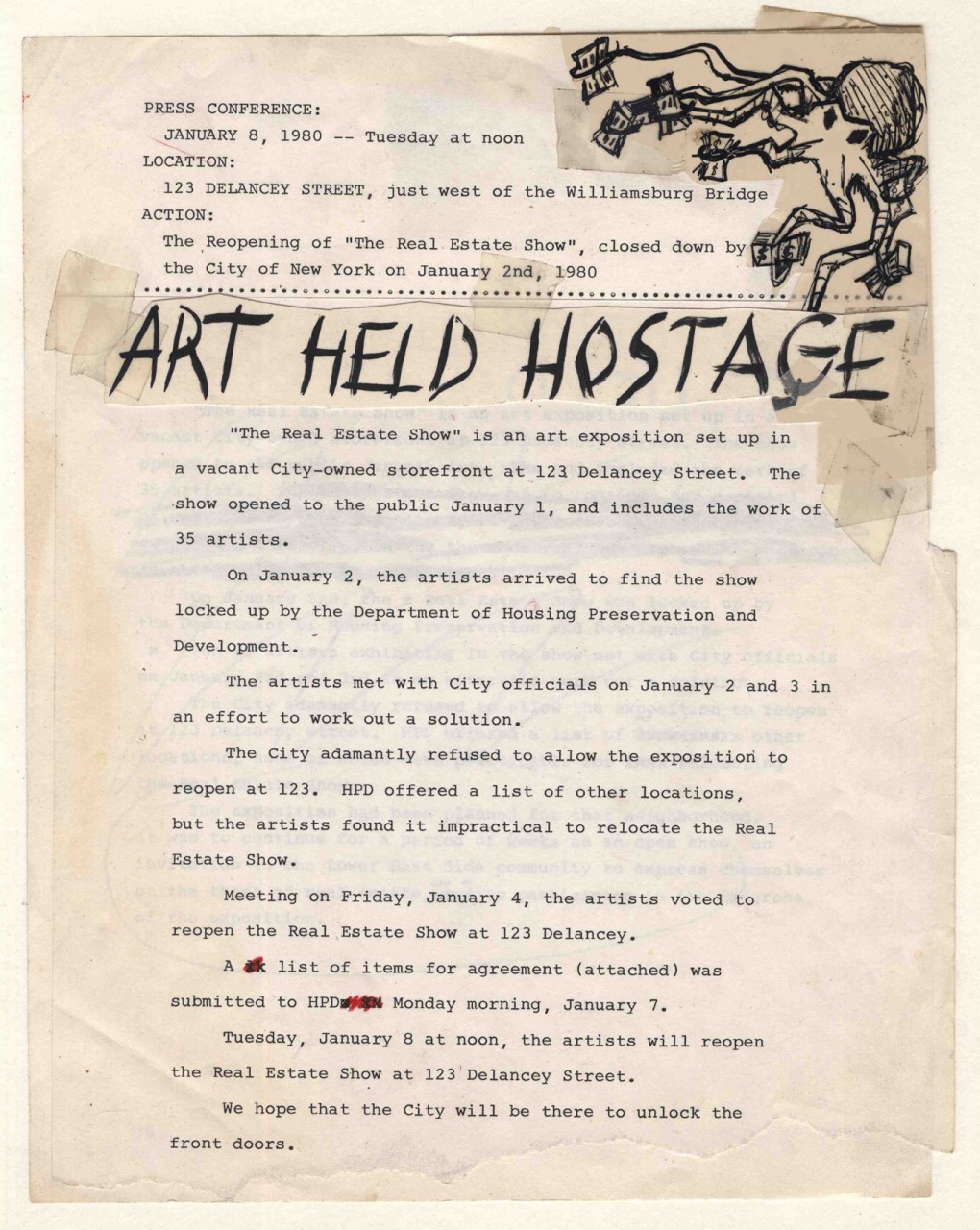 “The most recent effort along these lines-“The Real Estate Show”-opened on New Year’s Eve as a unique combination of art exhibition and guerrilla action. A group of downtown artists simply broke in and took over a derelict city-owned storefront right on teeming Delancey Street on the Lower East Side of Manhattan, turned on the heat and light (also “extralegally”), and filled the space with art protesting absentee landlordism, eviction, developers, the city’s waste of space, greed-the whole notion of property in a capitalist society. The show was dedicated to Elizabeth Mangum-“a middle-aged Black American killed by police and marshals as she resisted eviction in Flatbush last year.”
