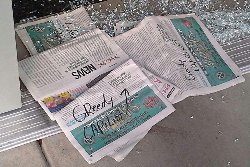 • Eugene Weekly does not condone or encourage acts of violence or destruction in the name of any cause. We were dismayed to find out that someone threw a large rock through the glass door of the Eugene Area Chamber of Commerce building in the early hours of Saturday, Feb. 13. The perpetrator also placed several copies of the Feb. 11 edition of EW — open to an article about the Chambers’ endorsement of the 2E Broadway proposal to privatize Kesey Square — with a misspelled scrawl stating “Greedy Capitlist” and “the Colinishen of Public Spase.” Chamber President Dave Hauser tells EW via email that they “found a bag of rocks nearby” and the Chamber has filed a police report. “The good news is that aside from the broken glass and damage to the door, nothing else was damaged and nothing was taken from the building,” Hauser writes.