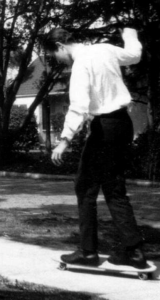 I am on my cousin Rand’s skateboard. He is dressed like a surfer, a Beach…