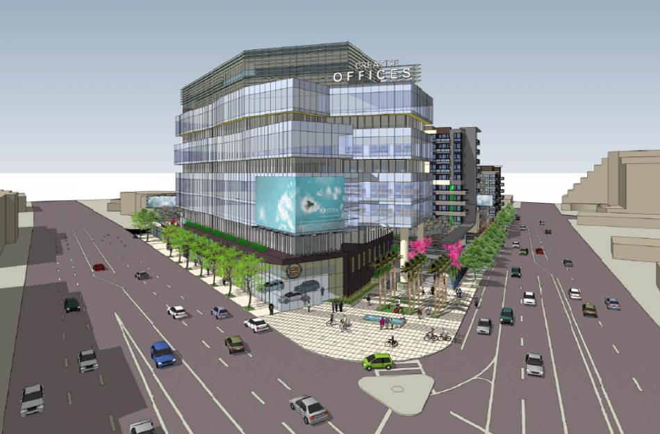 The redesign, crafted by global architecture firm Gensler, calls for an approximately 4.76-acre development with low-rise and mid-rise buildings, as well as a 10,000-square-foot pedestrian plaza with landscaping, water elements and outdoor seating.”