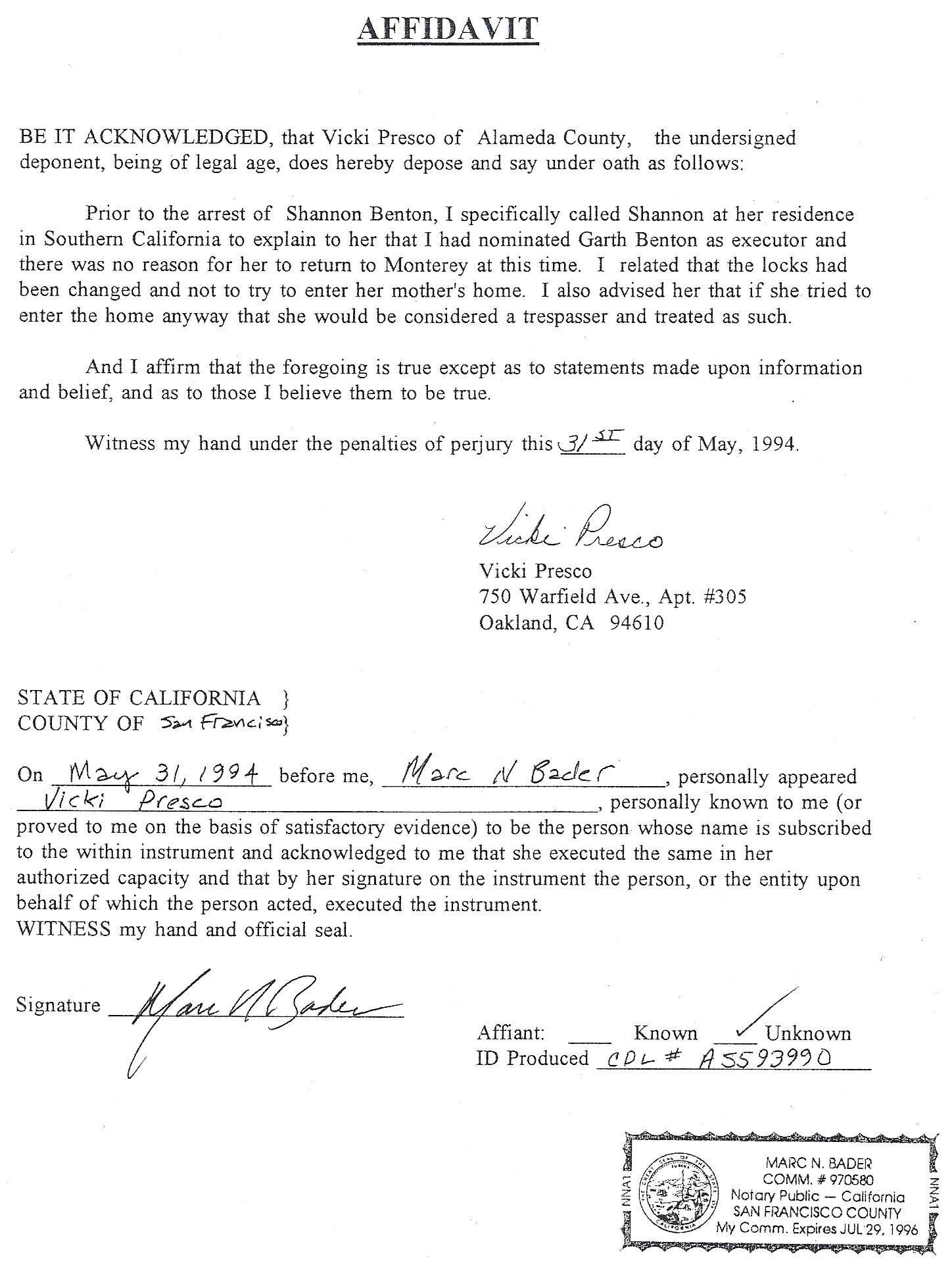 I can not forget the look they gave me when I told them to stay away from the gallery people and Christine’s fame, altogether, because there was a vicious fight going on over it. When I told them the two named executors in Christine’s Will, Jacci Belford, and Vicki Presco, filed a false police report and had the adult Heir thrown in jail, this Mother & Daughter team gave me a blank, cold, stare as they sat side by side. They had no empathy for my niece, their kindred they never met.