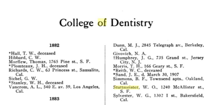 Here is a photograph of my great grandfather in the Oakland Hills. (far left) William Oltman Stuttmeister, graduated from the University of California in San Francisco, in 1886, and became a wealthy dentist. He played violin in the Oakland Symphony. He was a very cultured man. His wife played piano. They lived on Mcallister near Fillmore. Our house on San Sebastian was filled with his beautiful antiques, including his rare books. Bob and William are cut from the same cloth.They are alumni. I welcome any help I can get in preserving my family history – for the sake of art! For the love of Art!