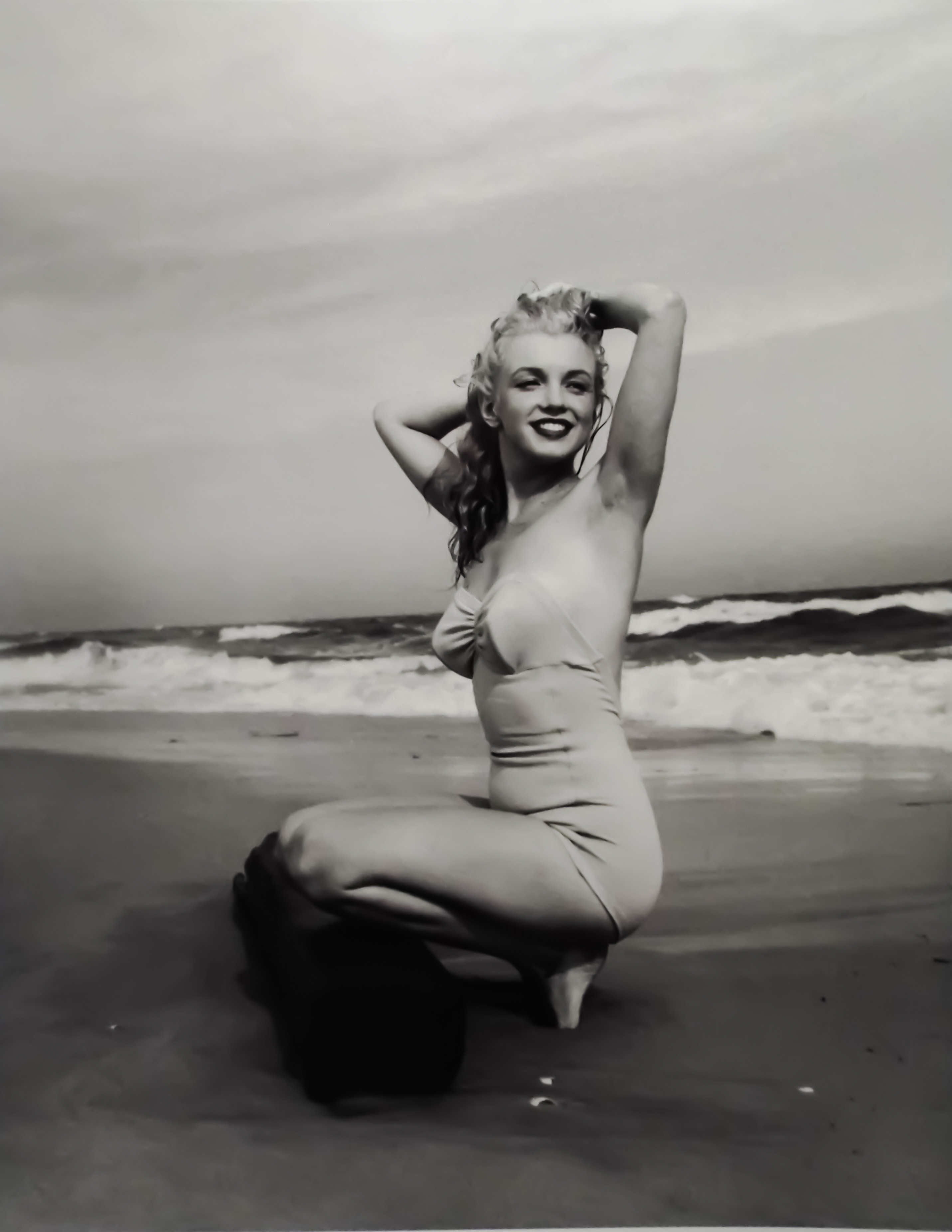 Fast forward three years, and Monroe was well on her way to becoming a celebrity. During a visit to New York, she got in touch with de Dienes, leading to a photo shoot on Tobay Beach on Long Island. In her 20s, de Dienes described her as “a magnificent, elegant young woman, sophisticated like [he had] never seen her before,” yet his photos tended to portray the former Norma Jeane as a casual beachgoer, hair wind-blown and face perpetually angelic. They would shoot together for the last time in 1953, in a dark valley in Beverly Hills, working off the light of de Dienes’ headlights.