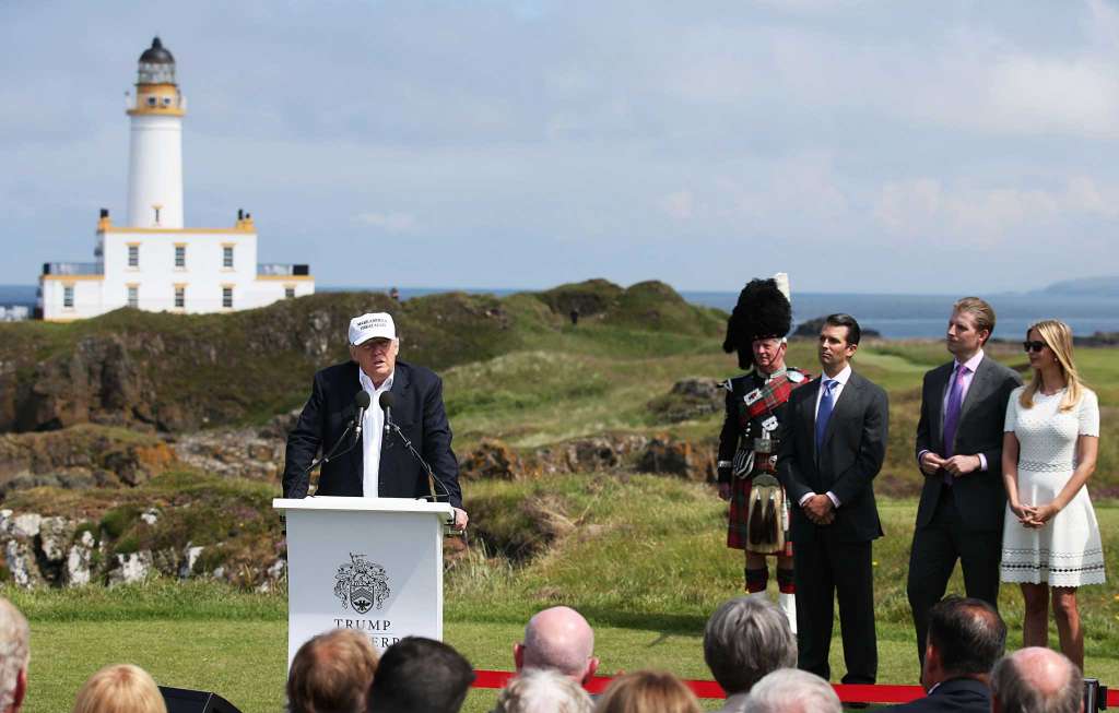 Nelson is rolling over in his grave. He talked about taking lunch in the lighthouse and moving on to the tenth hole – while Rome burned. This man is seriously mentallly ill – and his kids know it. They keep their mouth shut, as Deedly Daddly Doo rambled on about the many trust funds he is setting up for them – as stock markets crashed around him. He was OUT OF BOUNDS the whole speech! I expected to see the ghost of Winston Churchill in kilts, come forth and kick his ass, stick a bagpipe in it!