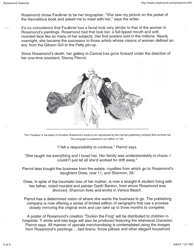 In 1997, Stacey Pierrot came out with her Rosamond webpage, that employed a minor as a smokescreen to conceal her criminal attempt at Art Forgery. Indeed, she employs a children’s hospital, and Christine Rosamond Benton’s eleven year old daughter and heir, to prepare Rosamond’s loyal fans for massive Art Fraud. How many contacted Ms. Pierrot and asked if they could contribute to this fake charity? How many designers called and asked if Rosamond’s Dunkin could be put on their “tote bag” or, designer dress? How would you like to awaken in a bed full of toads?