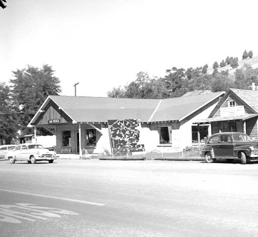 The cabin on the right was the home of Joaquin Miller as seen on September 18, 1958. Joaquin Miller (March 10, 1830-February 17, 1913) was an Oregon poet. His cabin at Canyon City, Oregon was made into a museum in 1922. The building next to the cabin is the Grant County museum. According to the sign over the entrance the museum exhibits old relics.