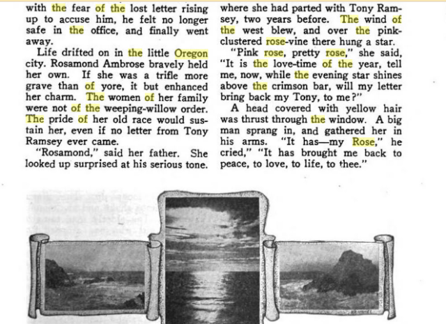 Above we see George Miller (who is not dead and stuffed) in front of his brother’s cabin he built in Canyon City, where Joaquin was elected Judge. The wire was put there to keep the monkeys from tearing off a shingle, and taking it home as a souvenir. Blanche Essex wrote ‘The Rose of Oregon’ that was published in the Overland Monthly. Because she is a woman, she gets to take all kinds of romantic liberties with Rosamond Ambrose, a woman with two Rose names. Rosamond swoons away in Oregon City. What is eerie, there are photos of Oregon’s rocky coast at the end of this story.