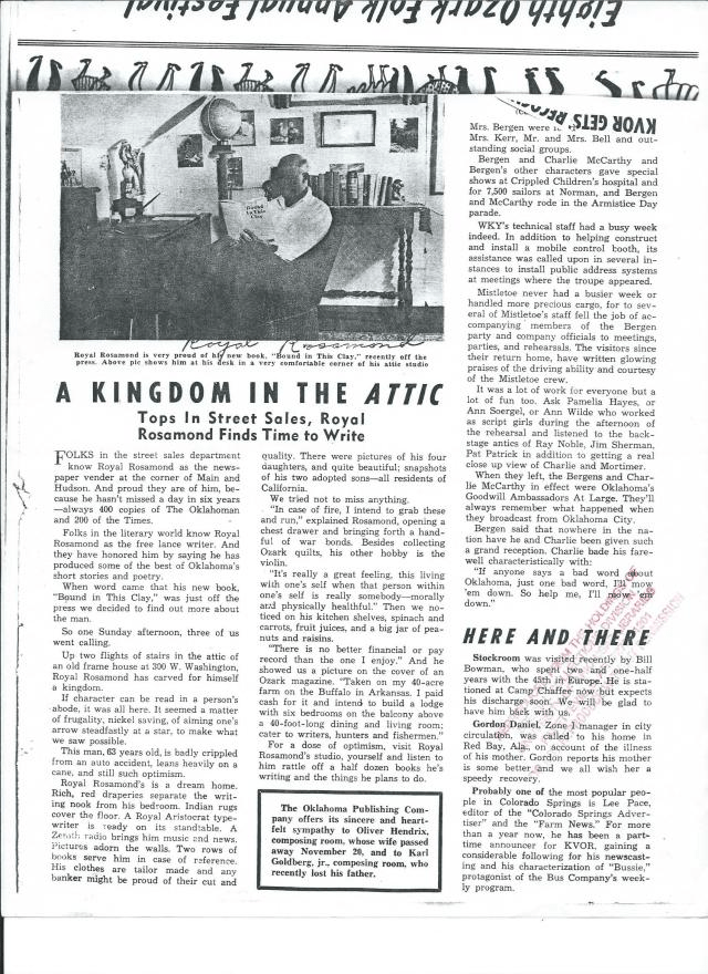 - Here is the article that appeared in the article that was published in the Oklahoman. Three newspapermen have come up to see him in his loft. They talk about him being crippled, and how he longs to be reunited with his four daughter. They are promoting him. He operates a newspaper stand and sells their newspapers. Gem Publishing is at the address of this attic. I am wondering if the owner, or, someone at the Oklahoman, is printing his book, and his newspaper ‘Bright Stories’. If so, this puts Royal Rosamond in a very unique position. He may be considered the first blogger. Did he sell his books and paper out of his newsstand?What all this adds up to, is my people were in desperate need of help. There is no welfare, child protection, help for a veteran who can not work, no birth control, no nothing. You had your family, but, they might be as worse off as you.