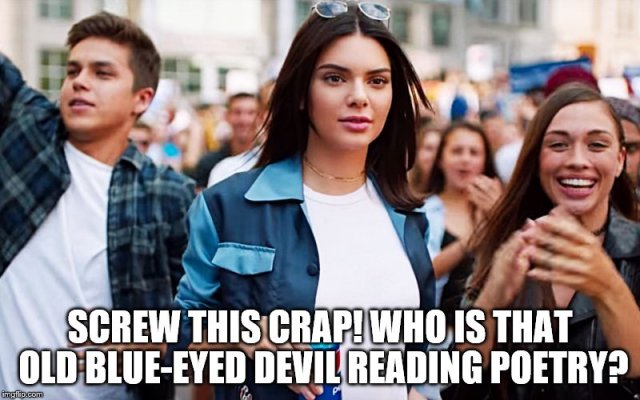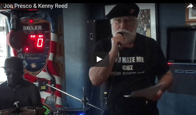Here I am wearing the T-Shirt Kenny Reed gave me – after Christmas! I wasn’t invited CUZ a production company was formed behind my back, and – I WAS TOO WHITE! I read my poem taken from my blog on the Baby Face of White Privilege. Kendall Jenner has a baby face. This is the real La La Land. Marilyn Reed gets up and sings after I read.