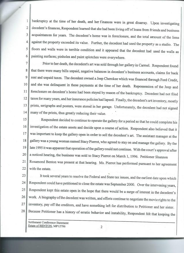 I am almost certain it was Robert Buck that gave me a menacing look at the funeral. I suspect he knew the Bentons, and stopped in the Rosamond Gallery located just around the corner from his law firm. Did he take sides in the divorce? After ten years of probate, Morris did not charge a legal fee. I stuck by Shannon when they went after her, saying she would destroy the estate, that Robert was bent on saving?