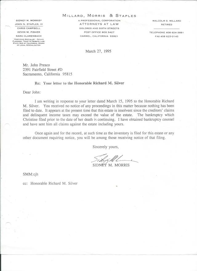 Here is more “discord” by non-family members. In the last six months I have exchanged cordial messages with Shannon a Larry who offered I was Christine’s mentor. How generous! I backed Shannon and paid a price. I honored my sister’s Will. Vicki and Mark Presco backed Garth, and Drew, a minor child. I was put out – with my father and my mother. That rich man who glared at me was told bad things about me. By whom? Morris knew all these intrigues. He went to lunch with Stacey Pierrot – from the start! Did Robert Buck know about these lunches? Are we looking at conflict of interest?