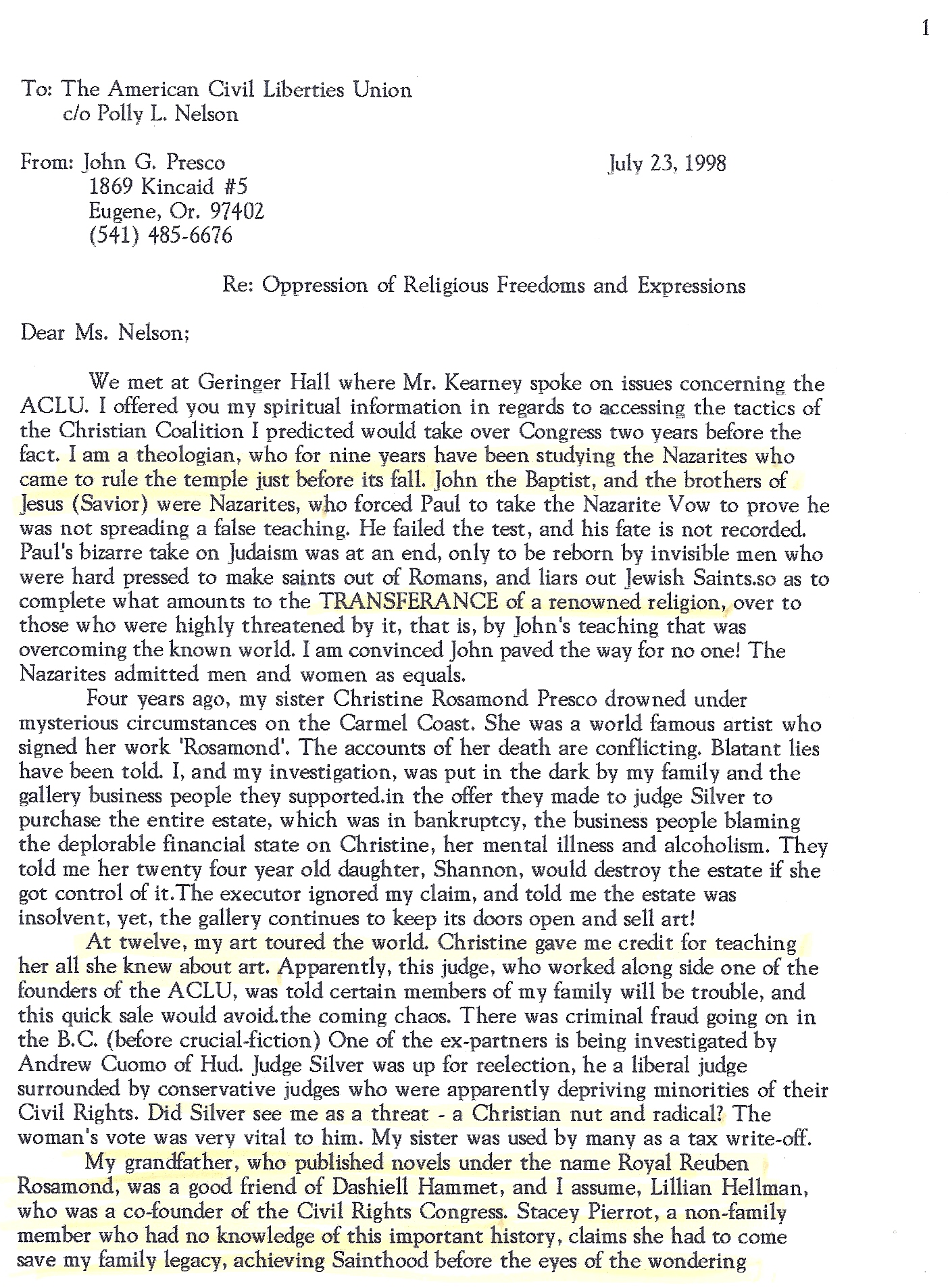 Below is my letter to the ACLU in regards of retrieving my Spiritual Program from ‘The Caretakers’. Upton Sinclair was born into an alcoholic family, and “founded a branch of the ACLU