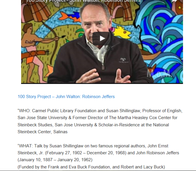 I see Shannon down in a Carmel dungeon, or, locked in a tower, while Lacy Buck prances freely about strengthening THE BUCK FAMILY HOLD on California History. Note the Steinbeck Studies that should include the fruit orchards that Frank Buck owned. I think Beryl Buck had not intention of funding the worship of a poet – and his home – outside Marin County. Just as Heisinger, Morris and Buck installed outsider, Stacey Pierrot in the Rosamond Gallery, Bob Buck has put a giant feather in his kindred’s hat, she getting to walk about the Tor home – as if she owned it. Latinos picked the pears and fruit off Buck trees. Was there stoop-labor involved?