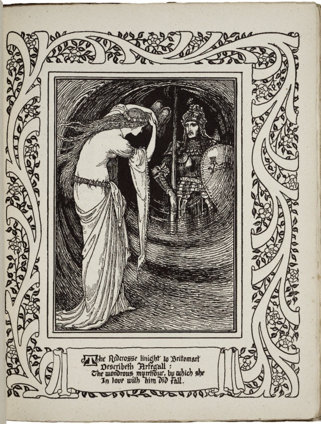 - Britomart, a female knight, the embodiment and champion of Chastity. She is young and beautiful, and falls in love with Artegal upon first seeing his face in her father’s magic mirror. Though there is no interaction between them, she travels to find him again, dressed as a knight and accompanied by her nurse, Glauce. Britomart carries an enchanted spear that allows her to defeat every knight she encounters, until she loses to a knight who turns out to be her beloved Artegal. (Parallel figure in Ariosto: Bradamante.) Britomart is one of the most important knights in the story. She searches the world, including a pilgrimage to the shrine of Isis, and a visit with Merlin the magician. She rescues Artegal and several other knights, from the evil slave-mistress Radigund. Furthermore, Britomart accepts Amoret at a tournament, refusing the false Florimell.