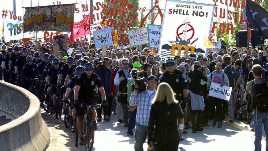 SEATTLE, WA – MAY 16: ShellNo flotilla participants float near the Polar Pioneer oil drilling rig during demonstrations against Royal Dutch Shell on May 16, 2015 in Seattle, Washington. On Saturday demonstrators began three days of protests both on land and on Puget Sound over the presence of the first of two Royal Dutch Shell oil rigs in the Port of Seattle. David Ryder/Getty Images/AFP