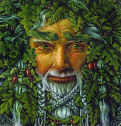 Often, these two entities are portrayed in familiar ways – the Holly King frequently appears as a woodsy version of Santa Claus. He dresses in red, wears a sprig of holly in his tangled hair, and is sometimes depicted driving a team of eight stags. The Oak King is portrayed as a fertility god, and occasionally appears as the Green Man or other lord of the forest.