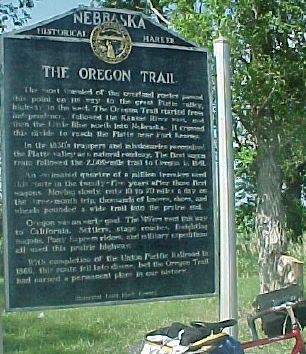 The Oregon Trail is a 2,170-mile (3,490 km)[1] historic east–west, large-wheeled wagon route and emigrant trail in the United States that connected the Missouri River to valleys in Oregon. The eastern part of the Oregon Trail spanned part of the future state of Kansas, and nearly all of what are now the states of Nebraska and Wyoming. The western half of the trail spanned most of the future states of Idaho and Oregon.