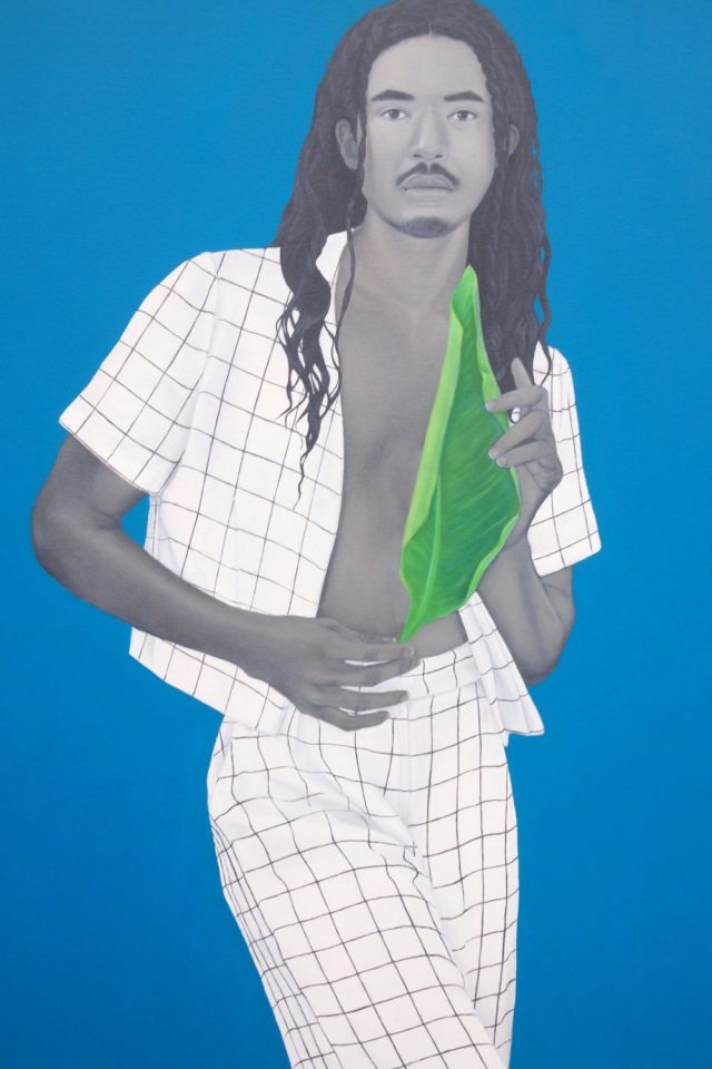 Each painting starts with a chance encounter of an individual that embodies certain resonating characteristics. I am continually searching for models and creating costumes for each character. Although the figure is painted in gray I photograph the models in color, and the skin color is then translated into gray on canvas by using black and naples yellow. I place the figure within an atmospheric background that represents a liminal space as opposed to one that would provide a context of place or time. Creating the impetus for the viewer to truly come face to face with the painted figure as if they are on stage underneath a spotlight. The liminality of the background also represents the amorphous personal space of my own existence within the context of black identity and my search for ways to clarify and ground it.