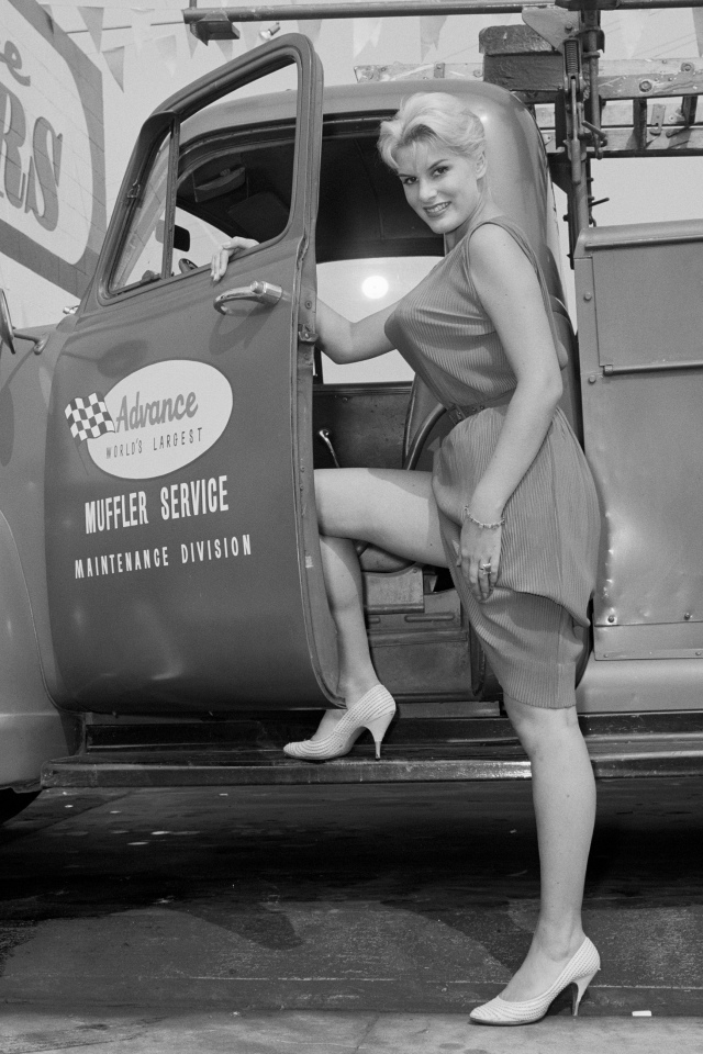 UNITED STATES – OCTOBER 13: Advance Muffler Publicity Photos With June Wilkinson. Wilkinson, fresh off her pictorial in Playboy magazine, lends her considerable talents to automotive endeavors like this promotional shoot and appearances at Riverside Raceway events. (Photo by Pat Brollier/The Enthusiast Network/Getty Images)