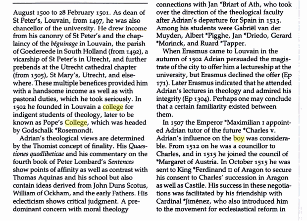 In November 1506 Margaret of Austria, Duchess of Savoy, became Governor of the Habsburg Netherlands and chose Adrian as her advisor. The next year Emperor Maximilian I appointed him also tutor to his seven-year-old grandson, and Margaret’s nephew, who in 1519 became Emperor Charles V. By 1512 Adrian was Charles’s advisor and his court obligations were so time consuming that he quit his positions at the university.[4
