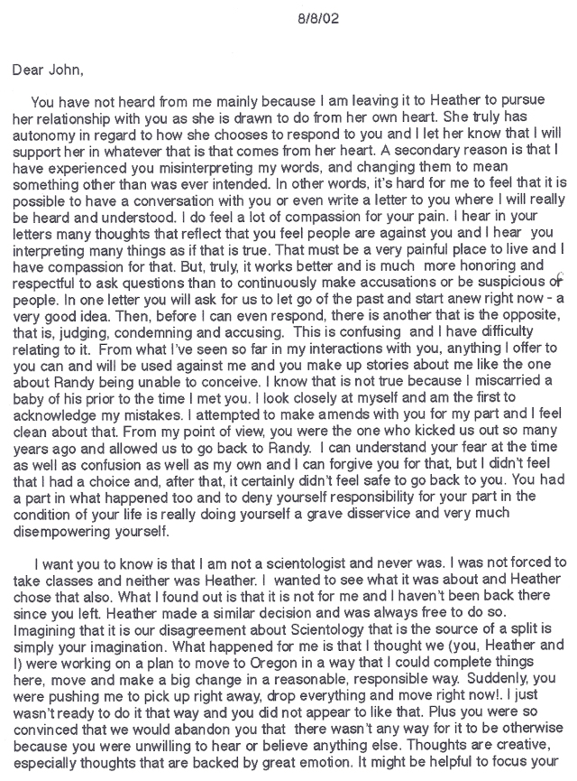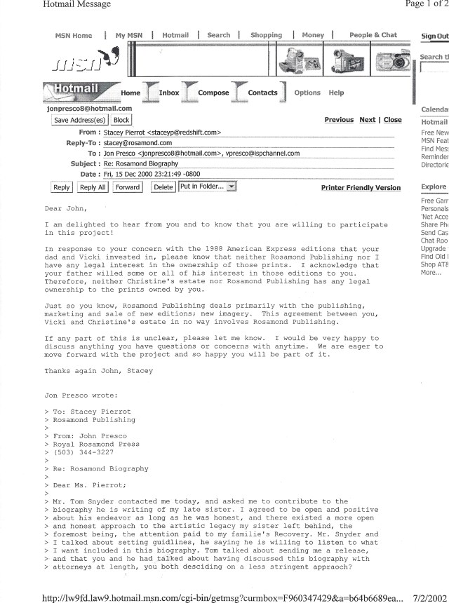 After Tom Snyder sent me his Non Disclosure Agreement to sign, I sent an e-mail to Stacey Pierrot, and copies of it to Vicki and Mark Presco. I called for family unity. Four months later, Patrice Hanson called me and asked if I remembered her. I said I did. When she told me she had something important to tell me, I said;
