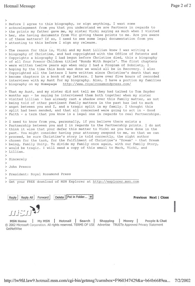 As the Trustee of our father’s Trust, Vicki Presco refused to give me these prints, even when Michael’s friend, an attorney, sent her a letter. In closing Christine’s probate, Sydney Morris, denied my claim for $4,000,000 dollars. I wanted to make sure I was I was the No.1 creditor in order to stop Lawrence Chazen, who tried to become Executor. He had filed a claim.