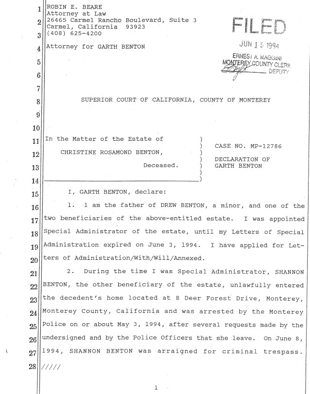 Special Executor, Sydney Morris said he was in touch with the IRS about back taxes. I am going to get these records. I am also going author complaints to the California Bar. My niece Shannon was put in handcuffs and taken to jail. When she asked for her mother’s remains, Garth Benton, went into his ex-wives home, got them, put them on the stoop, and slammed the door. He had tried to become the executor. When he failed, Chazen gave it a shot. He was the No.1 creditor. Shannon was accusing people of sexual abuse. Robin Beare was Garth’s divorce attorney. When Vick call her about his prints, she said;