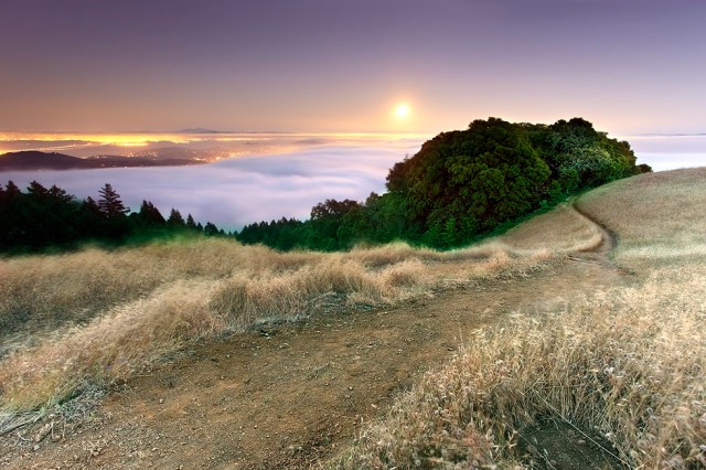 Once per month during a full moonrise at sunset, rangers on Mt. Tamalpais, just north of San Francisco have a moonlight walk. This is the only chance to see this place at night because the park closes at sunset. It was hot, dry and windy above the cold fog. You can literally walk from the cold fog to the hot winds and back again in just a few minutes!The wind bent the trees and grasses as the fog rolled quickly over the lower hills at Mt Tamalpais on a late spring evening. Most of the time when there is low ocean fog, the skies are clear, so seeing higher clouds in the sky is a rare event. I used a 1/2-second exposure to show a little motion in the fog and the foreground grasses. I like including motion whenever possible even if it is extra work. I had to shelter the camera and tripod with my body in order to avoid camera shake.The top of Mt Tamalpais during the May-October dry season is a great place to watch the fog flow and the sun set. Hiking can become hazardous, as the dry grass is very slippery. But the views are well worth the risk! This is why California is called ‘The Golden State.’ Not because of the Golden Gate, or the discovery of Gold in 1949. I chose an extra short exposure to show detail in the grasses, as there was not enough wind to show lots of motion. I chose this exact location to show where the redwoods meet the grassy curve on the left and show a peek of distant hills on the right horizon.