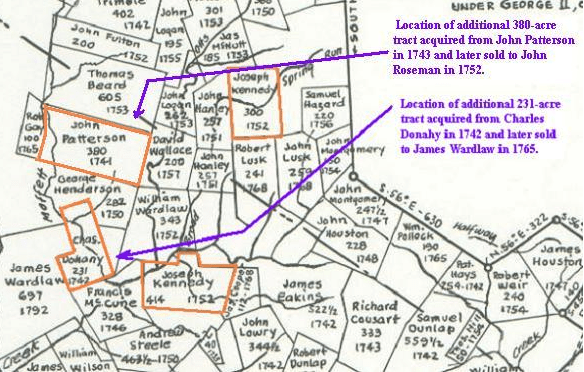- Page 204.–17th May, 1749. William Smith to Samuel Huston, 283 acres in Borden’s tract. Corner Joseph Kennedy’s corner, Greenlee’s line. Teste: Alexander Moore, James Trimble, James McKown.