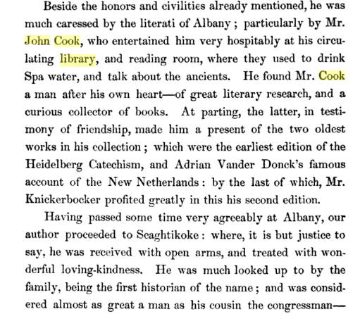 Washington Irving finds himself in the library of John Cook, who may be a fictional character, or, he may be Henry Brevoort who had a rare library, much of it about Dutch history. Cook gives Washington two books to read that are the foundation of his history; ‘The Heidelberg Catechism, and, the Dutch history compiled by Adriaen Cornelissen van der Donck.