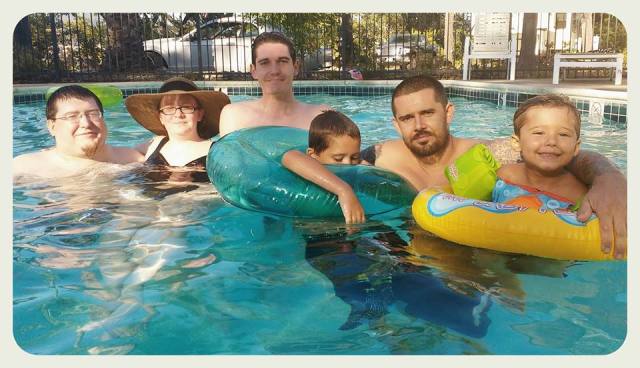 O.K. We got a mother and her baby, and, a male that shares the same blood, but, I am not the father of the child. I am the father of the mother. Are there any photos of the father of the child, with the mother of the child – with the child between them? No! This pic is embossing for its like – I am the father! Who is the father of my grandson, Tyler Hunt? Where is he? Oh, there he is, in the pool with his mother Hippie Holly Goddess of Love. These are Holly’s Boys. There’s one more. He took the pic. There might be another child, born of Bartender, Jessica Hallock, whose son is on the far right. That is Tyler in the tube. That is Ryan Hunt in the middle.