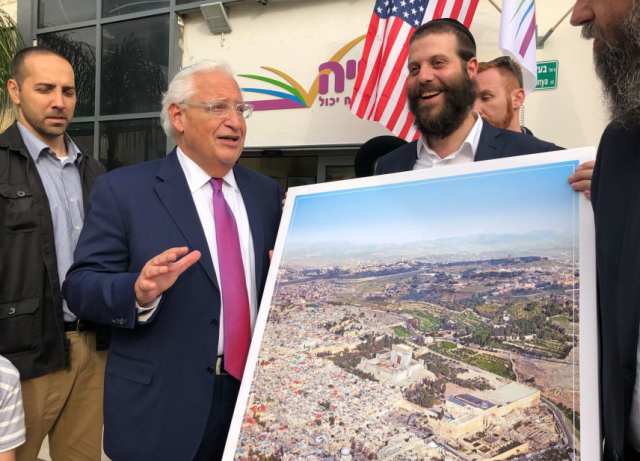 Ambassador David Friedman, while visiting a charity for children with learning disabilities, was photographed with a man who held a large aerial image of Jerusalem. The image was doctored to show the Third Temple on Temple Mount — so-called because the previous two temples were destroyed by Babylonian and Roman forces — built in the place of Al-Aqsa Mosque and the Dome of the Rock. The mosque, the third-holiest site in Islam, was built on the grounds of Judaism’s holiest site following the Muslim conquest of Jerusalem in the 7th century.