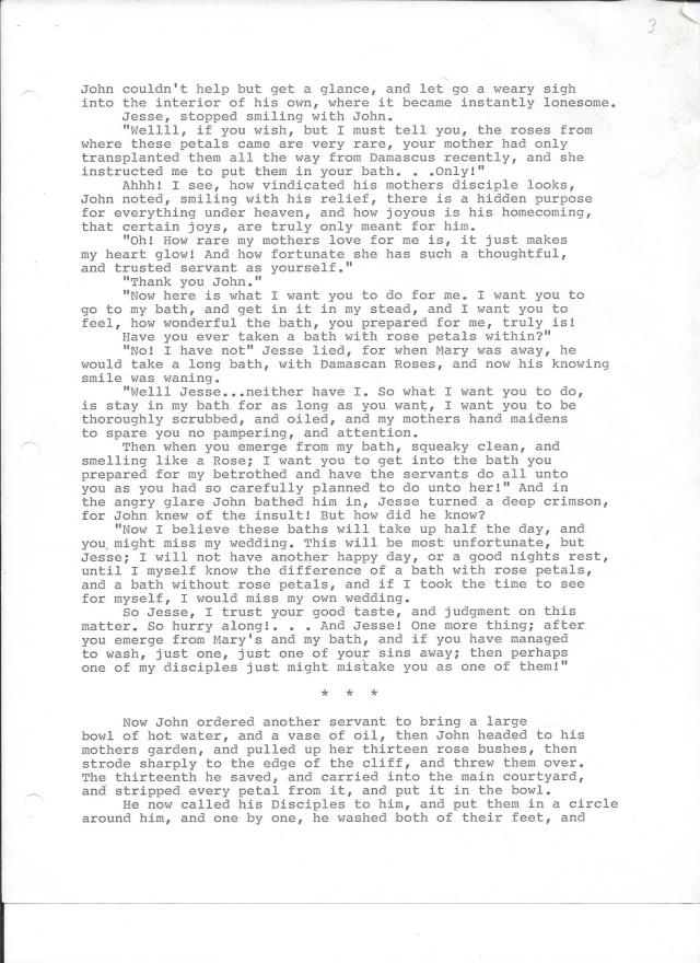 In these three pages ( I have to find the others) John has come to the island of Cyprus with his wife, Mary Magdalene, and HIS twelve disciples. John’s mother is very wealthy and powerful. She does not appove of her sons religious work. She instructs her servants to undermine it.