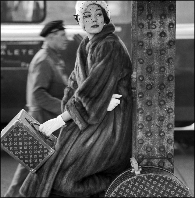 Maison Louis Vuitton. Manteau et chapeau. Manteau brun en vison Pastel Saga de Canada Furs. Chapeau blanc à voilette à pois noirs de Gilbert Orcel. Gants de pécari lavable de G. France. Bagages Vuitton. Paris, automne-hiver 1957. Mannequin : Simone d’Aillencourt. Photographie d’Henry Clarke (1918-1996), publiée dans Vogue France, Décembre-Janvier 1957-1958, p. 102. Galliera, musée de la Mode de la Ville de Paris. Dimensions : 6 x 6