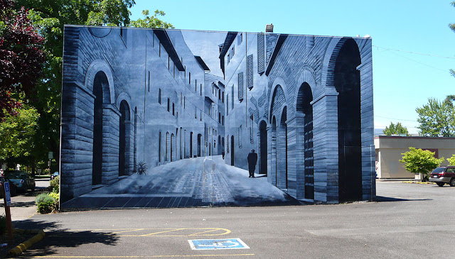 Here is Eugene’s famous mural. The lone figure is an Italian Tailor who taught Marilyn Reed how to make clothes. He made clothes for the Pope when he was sixteen when his Master Tailor got sick. Julio was a Master Taylor.