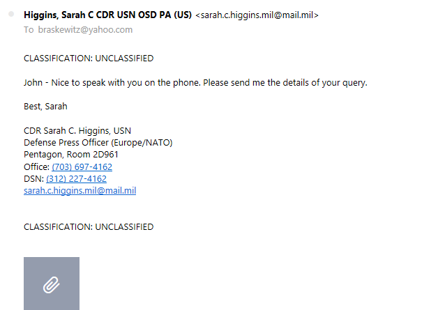 Above is a photograph of Sarah Higgins. We talked on the phone about the organization that Admiral Easton commanded. She never heard of the College of Defence Studies and said she would get back to me.