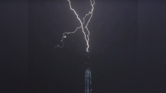 Videos recorded by residents show huge bright bolts of lightning as they come down, hitting the top of Europe’s tallest building, cascading around the structure, surrounded by dark skies.