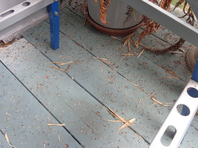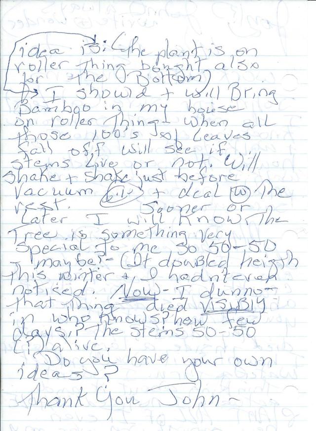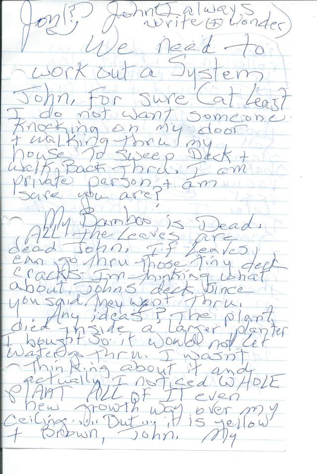 “Jon!? John(I always write and wonder) We need to work out a system. John, for sure (at least) I do not want someone knocking at my door + walking thru my house to sweep deck+walk back thru. I am private person + and am sure you are. My bamboo is dead. All the leaves are dead John. If leaves can go thru those tiny deck cracks, I’m thinking, what about John’s deck.”